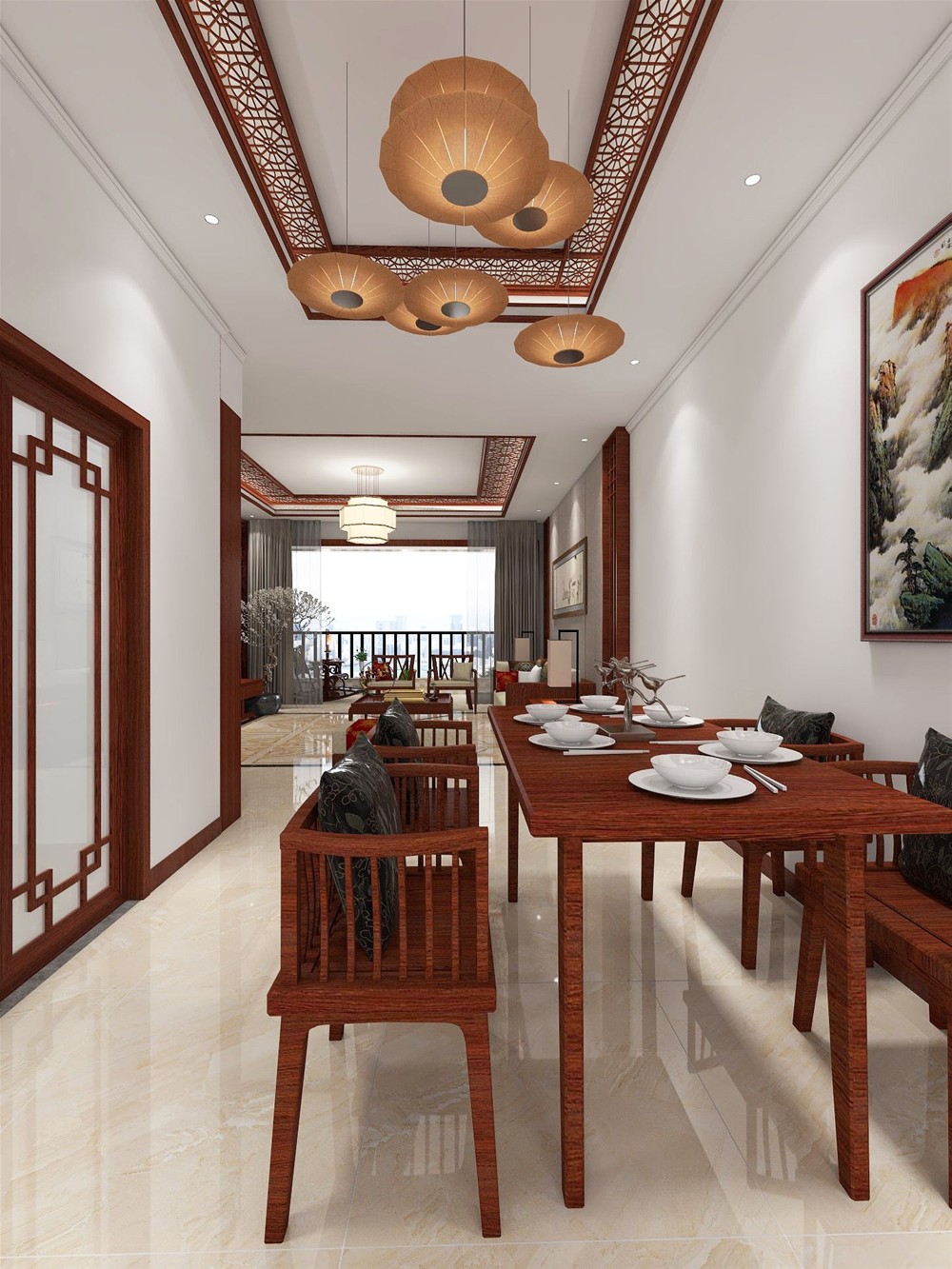 新中式之美,美在包容。實木桌椅搭配白色吊燈,兩種質感在空間中碰撞磨合,吊燈的光暈下處處流溢出歲月的含香。